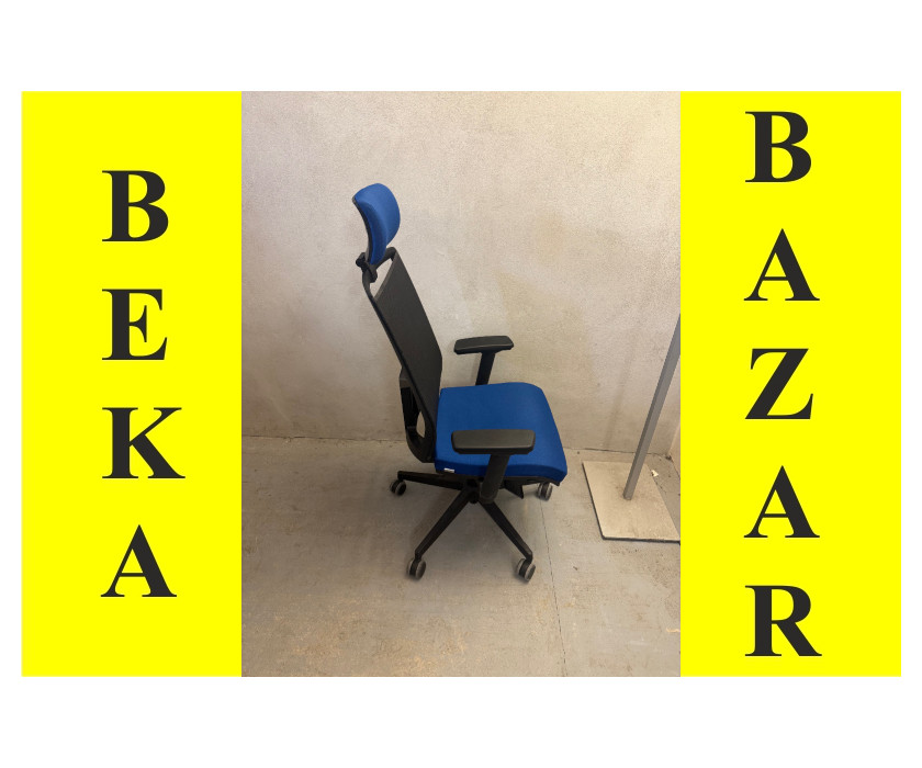 K prodeji nabízíme kancelářskou kolečkovou židli Antares. Židle má modrý podsedák a modrou opěrku hlavy, zádová část je síťovaná černá. Židle má 5-ti bodový kříž s kolečkama a je v dobrém stavu.