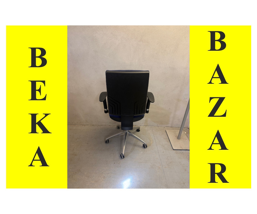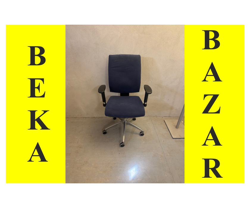 K prodeji nabízíme kancelářskou kolečkovou židli modré barvy. Polstrování je semišové, konstrukce má 5-ti bodový kovový kříž. Područky jsou výškově nastavitelné, stejně tak zádová opěka se dá nastavit a podsedák. Židle v dobrém stavu.