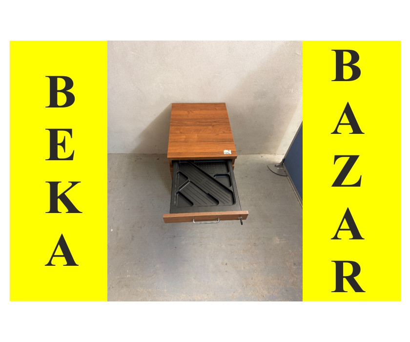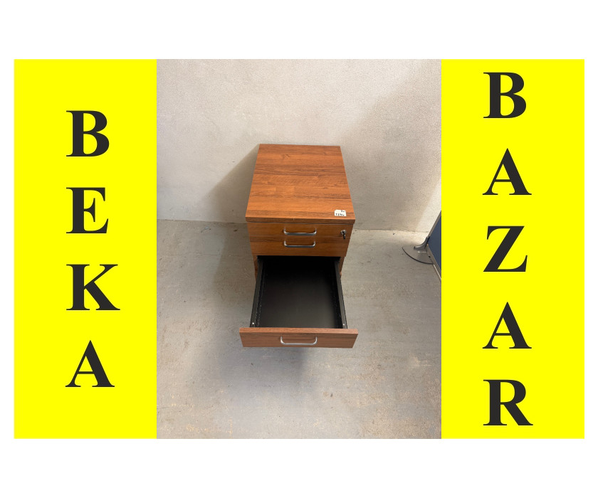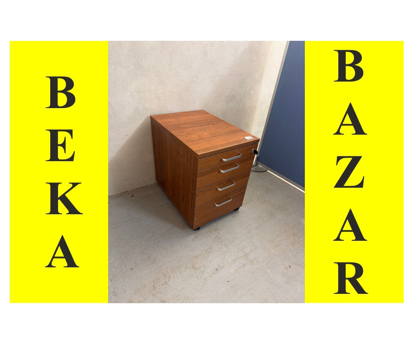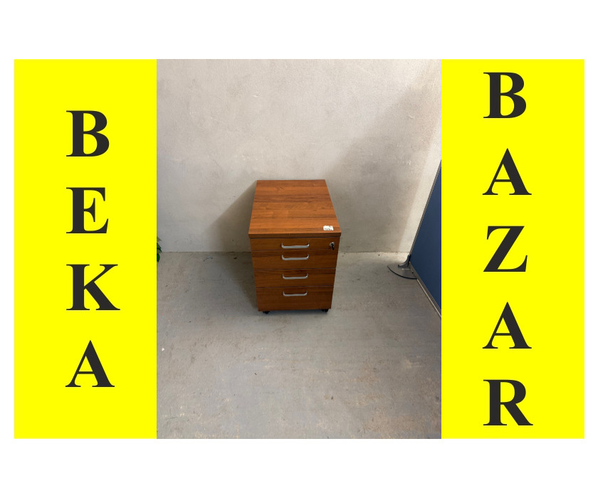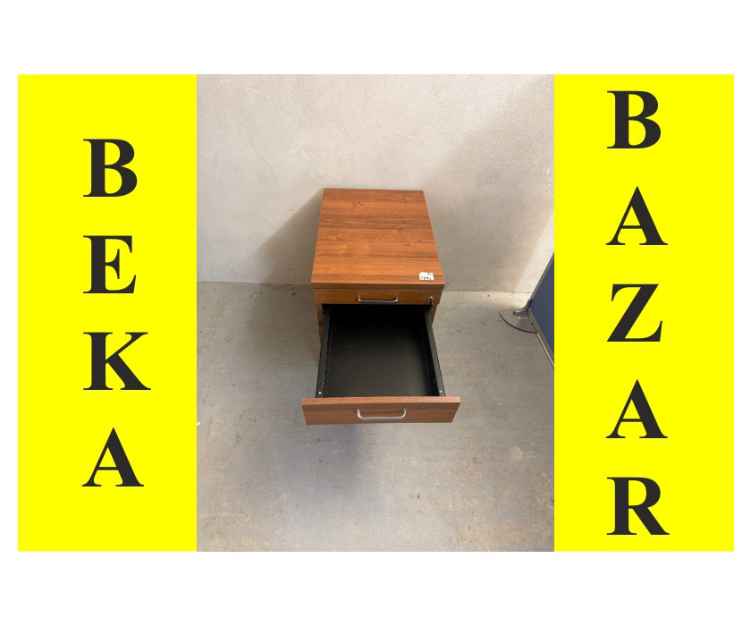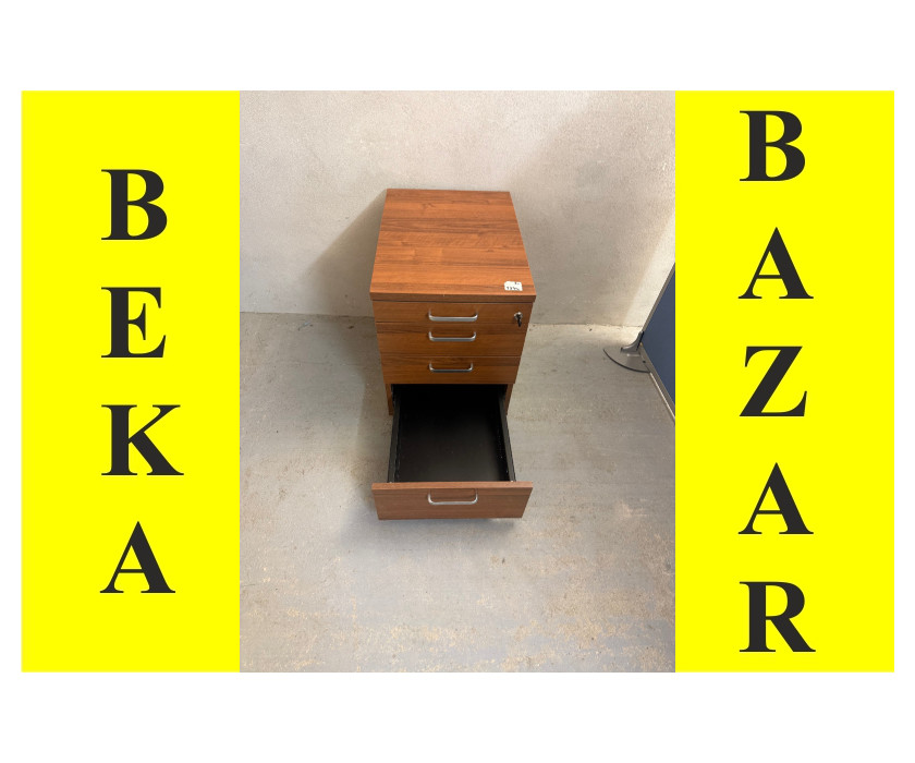 Nabízíme k prodeji kancelářský kontejner pod stůl v dekoru ořech. Kontejner je na kolečkách, která mají aretaci. Šuplíky jsou 4, první je úzký plastový pro drobné kancelářské potřeby a zbytek je z plechu. Rukojeti jsou hliníkové, a kontejner je s klíčem.