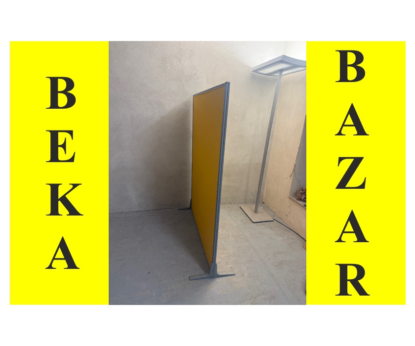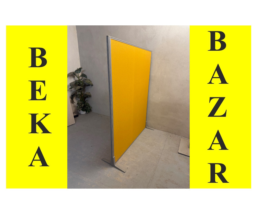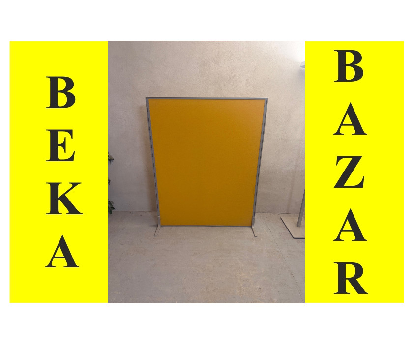 Nabízíme k prodeji volně stojící žlutý paravan. Paravan má hliníkovou konstrukci, kovové nohy a výplň je dřevěná deska potažená látkou. Paravan je oboustranný.