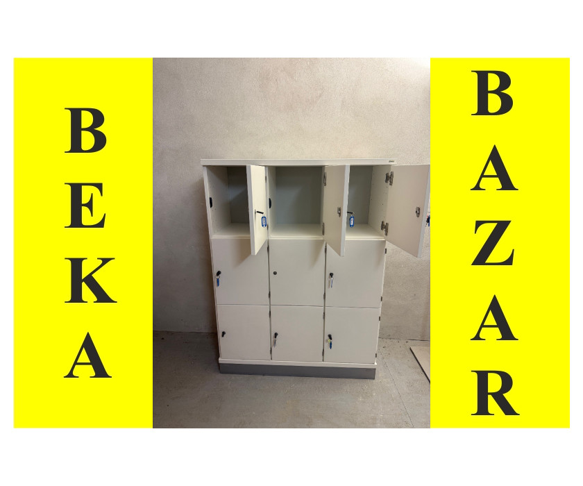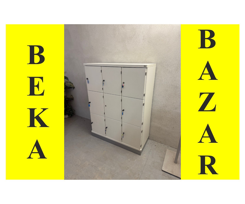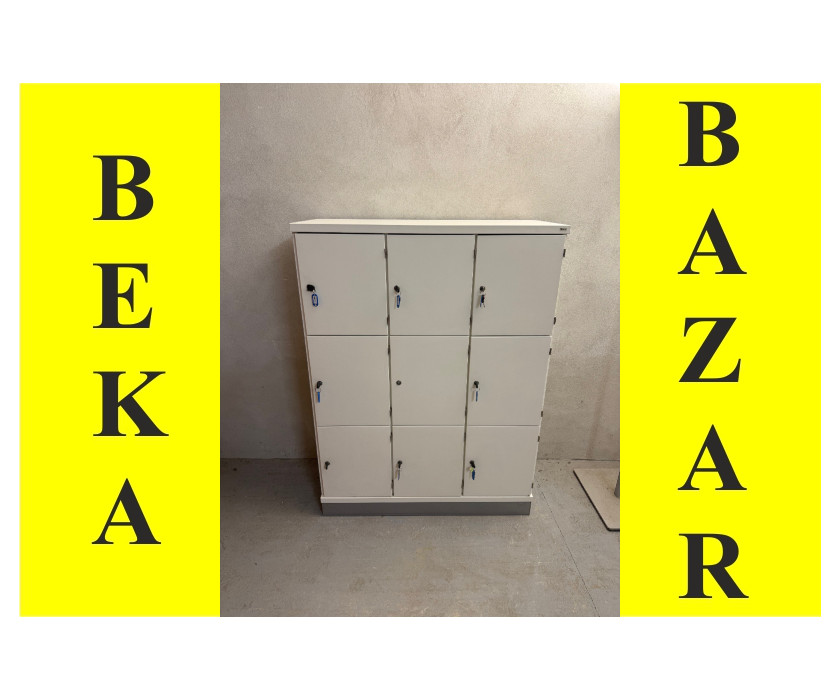 Nabízíme k prodeji 9-ti box dřevěný, bílé barvy. Jedná se o komplex malých skříně, přičemž každá skříňka má vlastní klíček. Box je v dobrém stavu, je na plastovém soklu a má vyrovnávací nožičky.