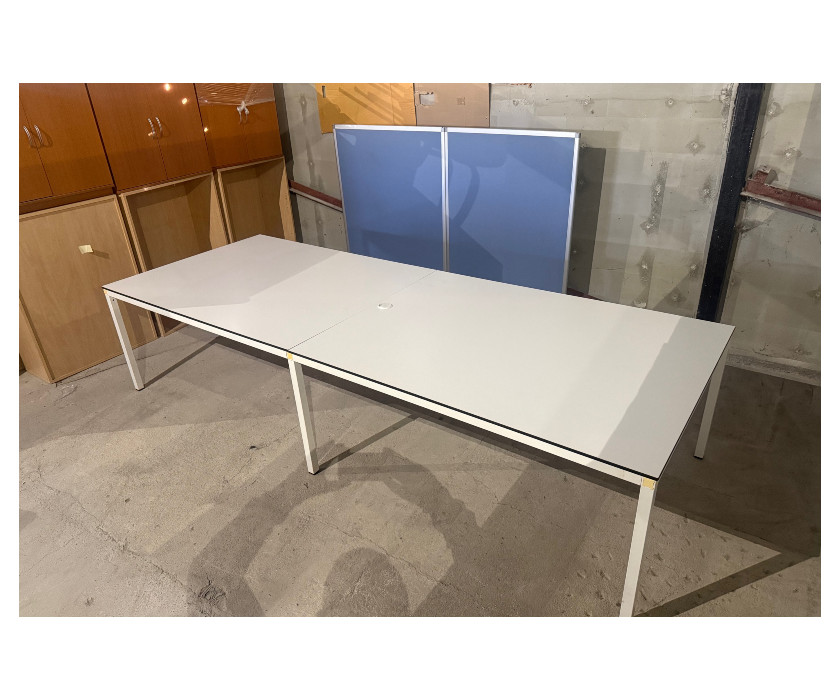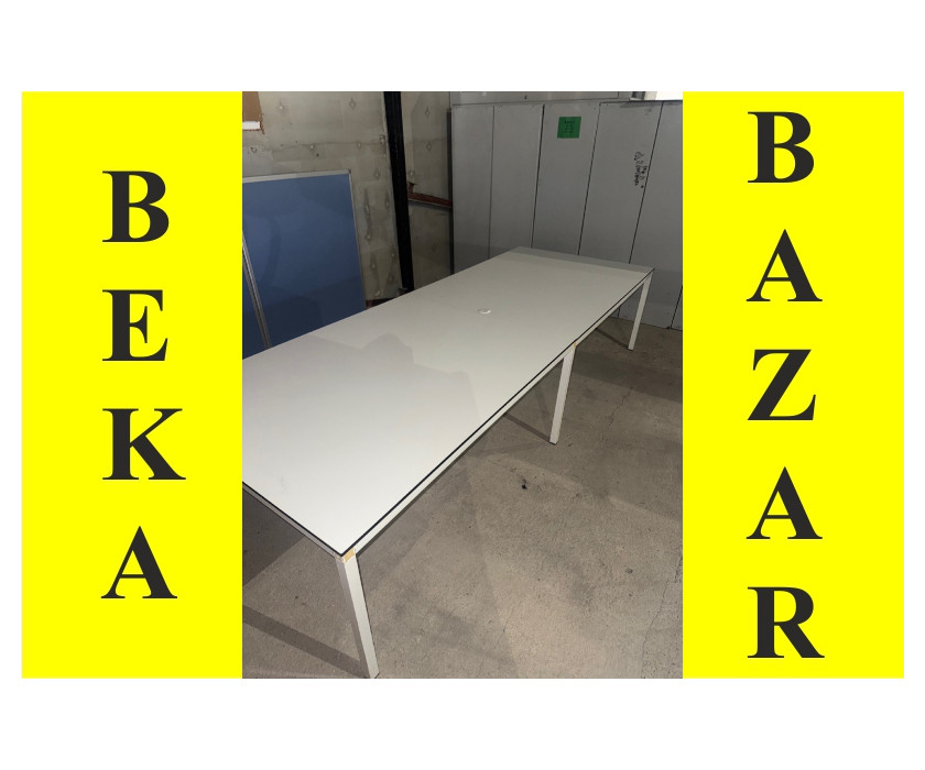 K prodeji nabízíme bílý zasedací stůl. Stůl se skládá ze dvou částí, má pevnou kovovou konstrukci a vyrovnávací nožičky. Deska stolu je pevná a má záslepku na protažení kabelů. Celkově je stůl v dobrém stavu.