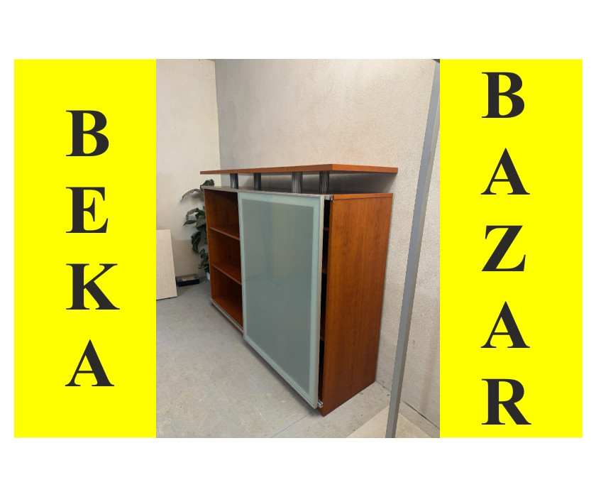 K prodeji nabízíme velmi pěknou skříňku , která má na vrchu nastavenou polici. Skříň má šoupací dveře s matným sklem. Dveře lze ponechat na jakékoli straně. Uvnitř skříně jsou na levé straně 2 police, na pravé straně je 5 menších polic. Šoupací dveře jsou zasazeny v hliníkových lištách. Skříň je pevná a pěkná.