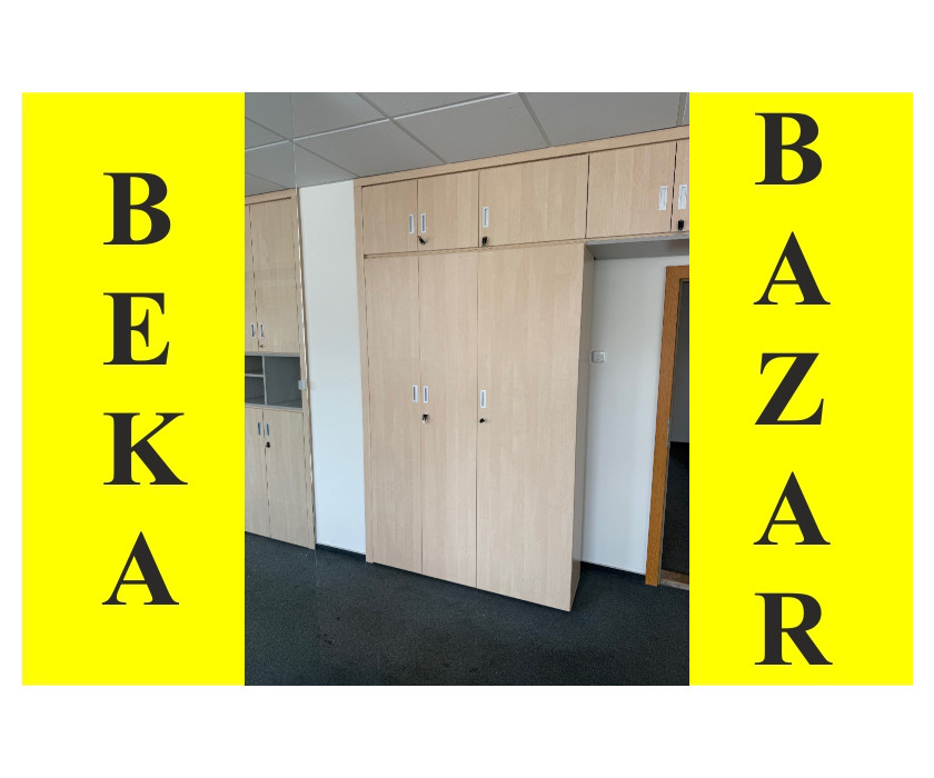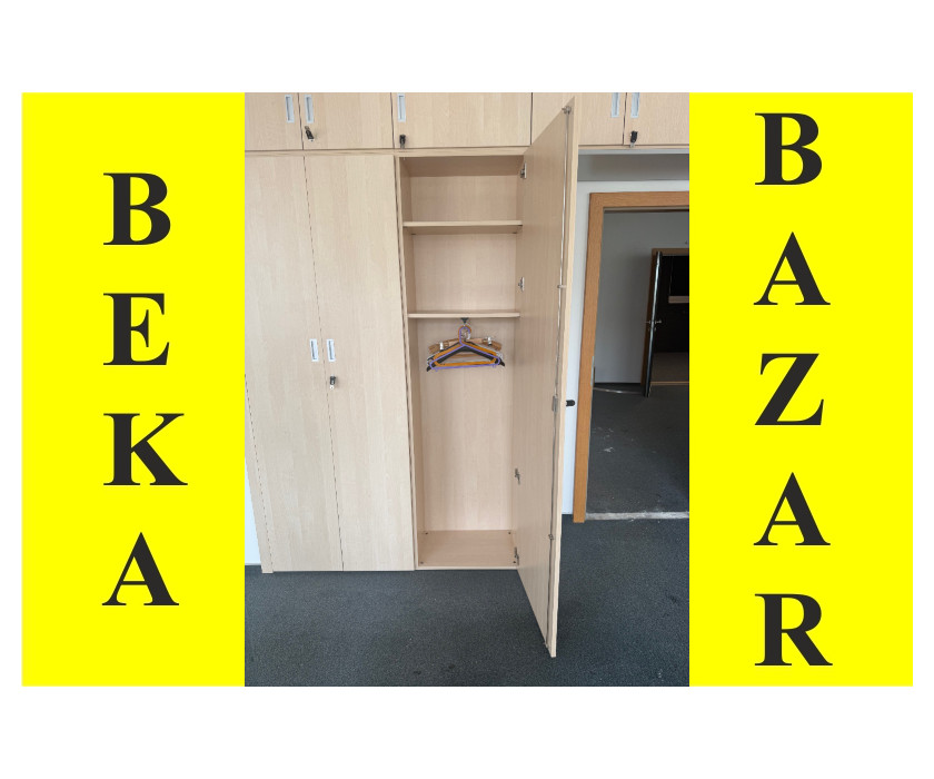 K prodeji nabízíme šatní skříň s nástavcem. Skříň je ve světlém dekoru. Uvnitř skříně jsou 2 police a jeden pojezd na ramínka. Skříň i nástavec mají zámek s klíčem. Dveře mají hliníkové hranaté rukojeti a skříň má vyrovnávací nožičky.