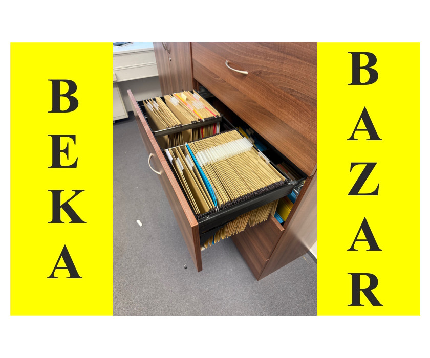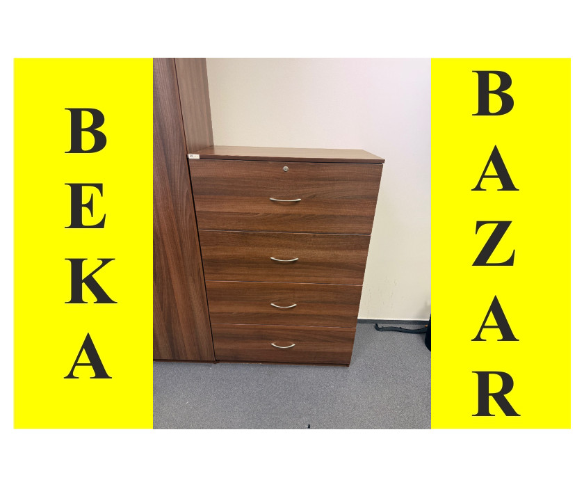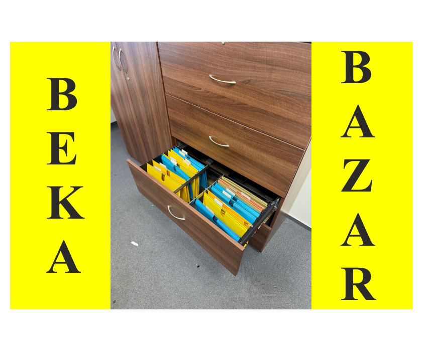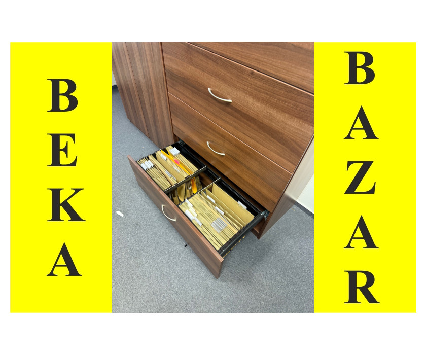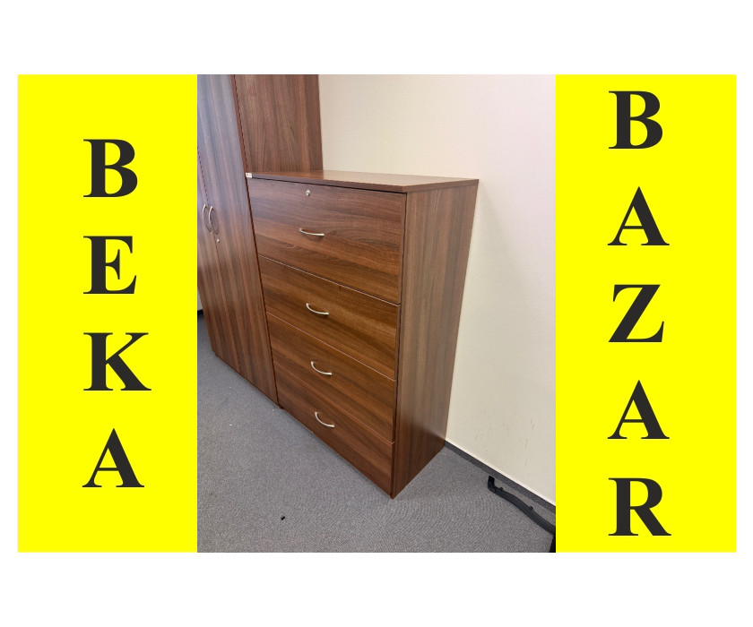 K prodeji nabízíme kancelářskou skříň jako kartotéku v dekoru ořech. Skříň má 4 šupliky, které jsou na závěsné šanony. Šuplíky jsou bez klíče, mají plastové rukojeti . Celkově je skříň v dobrém stavu a stojí na dřevěném soklu.