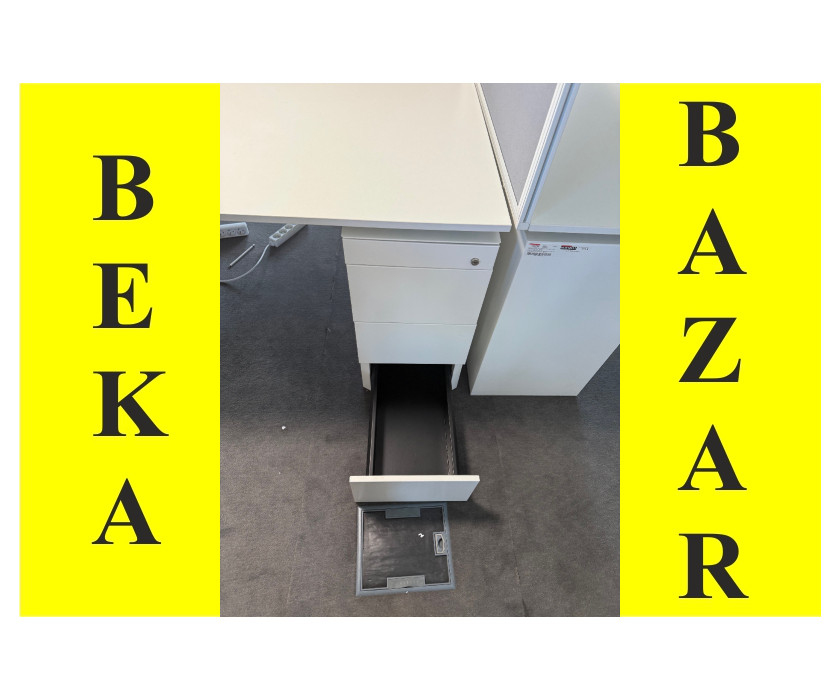 K prodeji nabízíme kancelářský PC stůl v bílé barvě s šedým paravanem,  který má na jedné straně kontejner a na druhé straně element. Nabízíme možnost provedení kontejner na pravé straně a element na levé, nebo obráceně, tedy kontejner na levé straně a element na pravé. Kontejner má první šuplík plastový a úzký na drobné kancelářské věci,zbytek šuplík - 3 šuplíky, jsou plechové . Některé kontejnery mají klíč. Element se dá použit i na závěsné šanony. Část pro zavěšení šanonů je vyjížděcí. Celkem má element 2 patra. Deska stolu má záslepku na kabely. Celkově je stůl v dobrém stavu.