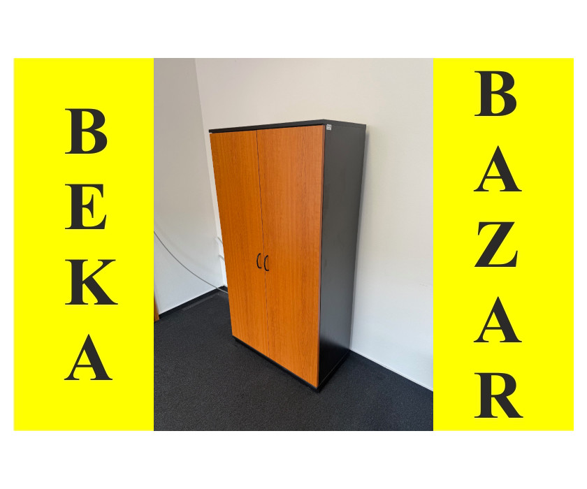Nabízíme k prodeji kancelářskou regálovou skříň v dekoru třešeň. Skříň má dveře originál bez zámku, kovové rukojeti. Korpus skříně je černý a dveře v dekoru třešeň. Skříň stojí na dřevěném soklu a vyrovnávacích nožičkách. V dobrém stavu.