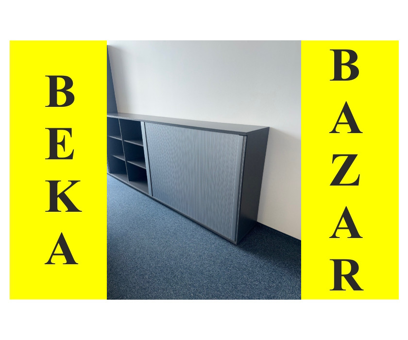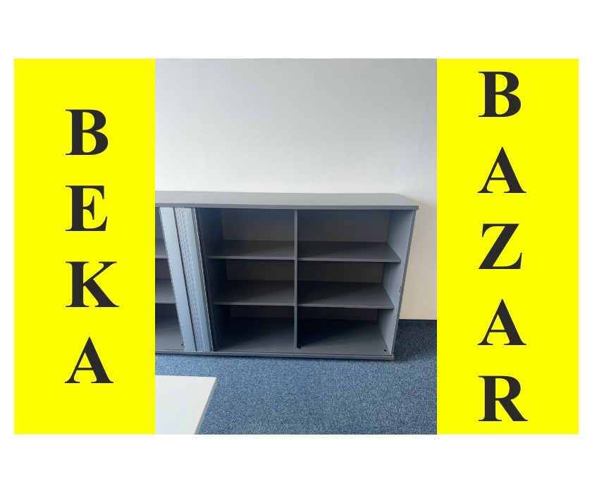 K prodeji nabízíme kancelářskou roletovou skříň Bene v šedém dekoru. Roletka je plastová originál bez zámku. Uvnitř jsou 4 police a má vyrovnávací nožičky.