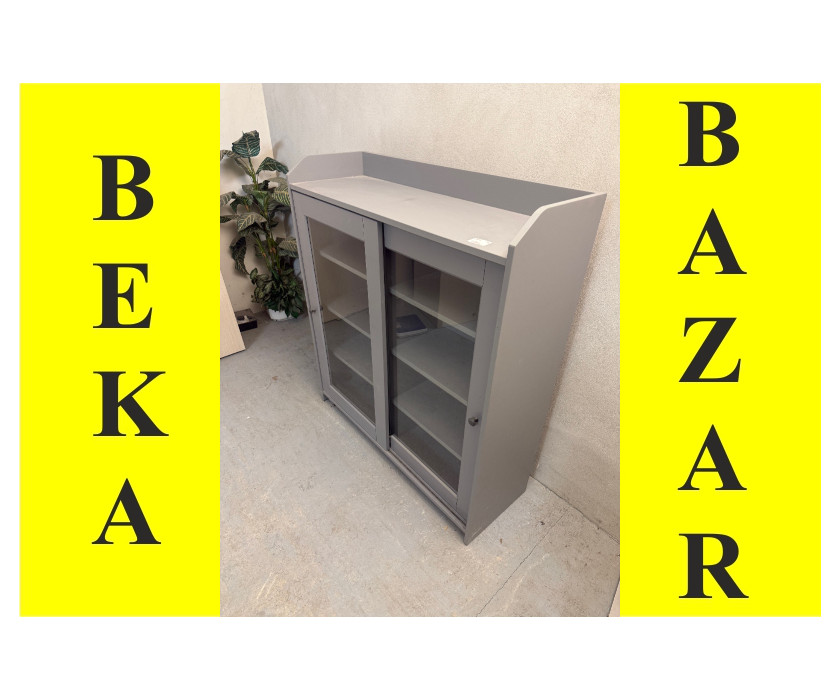 Nabízíme k prodeji šedou skříň Ikea. Skříň má prosklené šoupací dveře. Uvnitř je 6 polic ( 3 na každé straně). Dveře mají dřevěné rukojeti a skříň stojí na dřevěném soklu. Celkově je skříň v dobrém stavu.