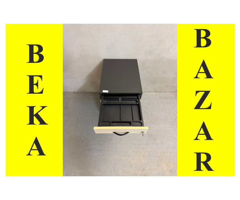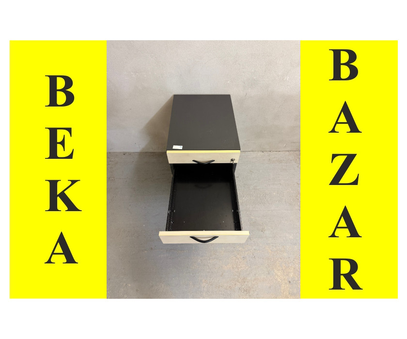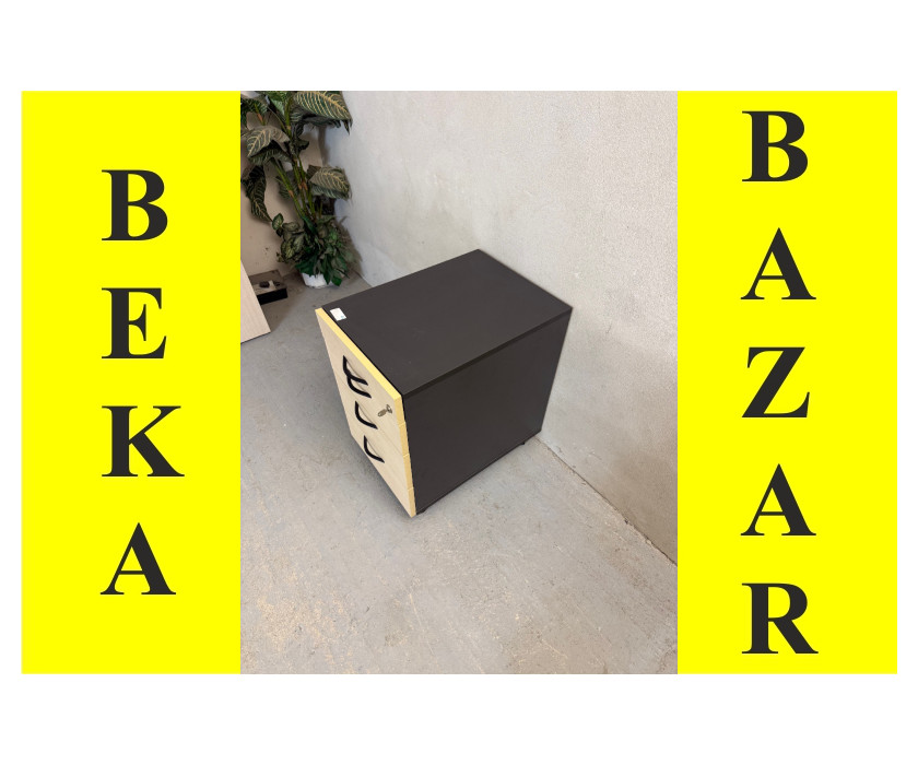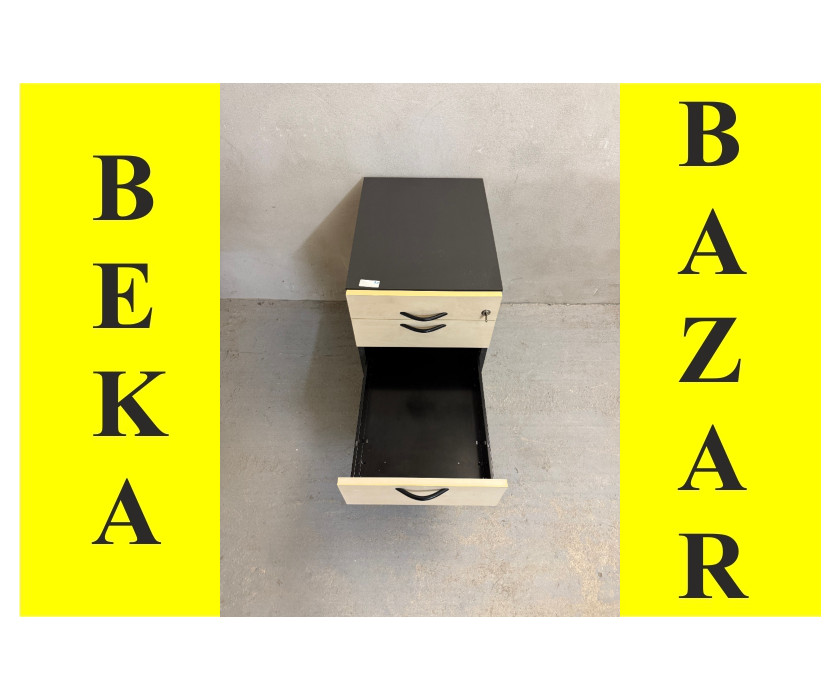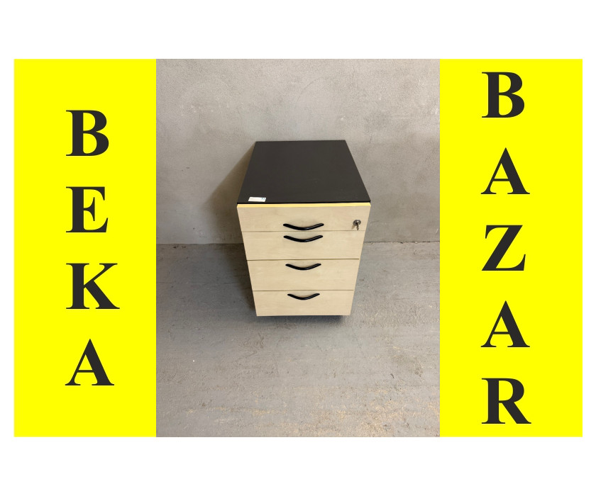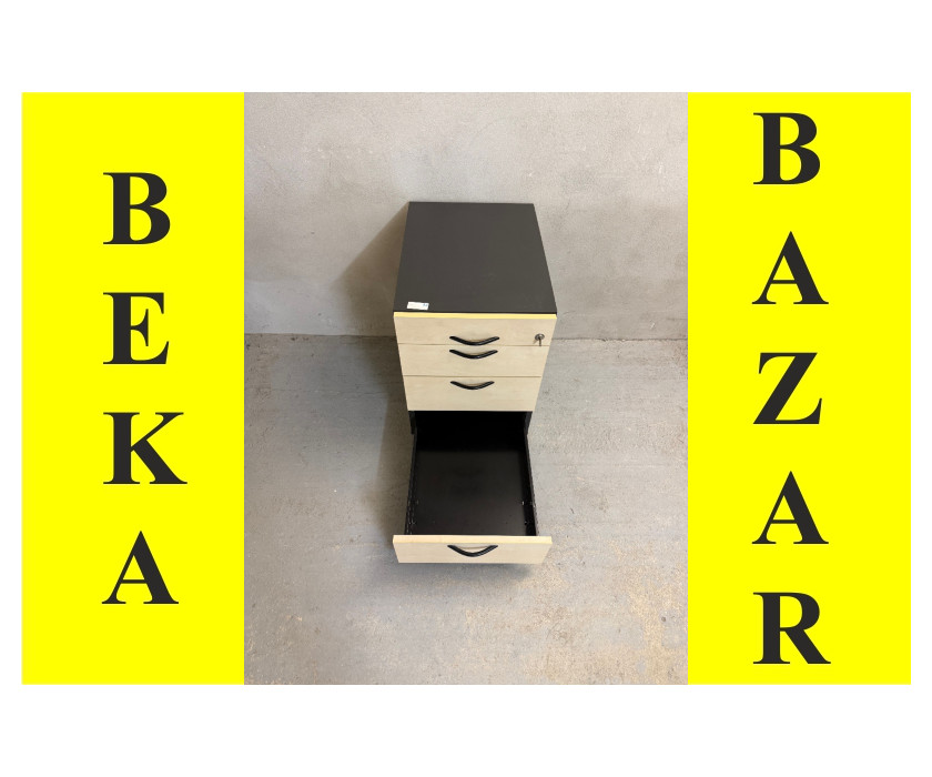 K prodeji nabízíme kancelářský kontejer pod stůl. Kontejer je ve světlém a šedém dekoru. Kontejner má 4 šuplíky, první je úzký , plastový, na drobné kancelářské věci, zbytek klasické plechové šuplíky. Rukojeti jsou kovové. Kontejner má šedé boky, kolečka a je s klíčem. Celkově je kontejner v dobrém stavu.