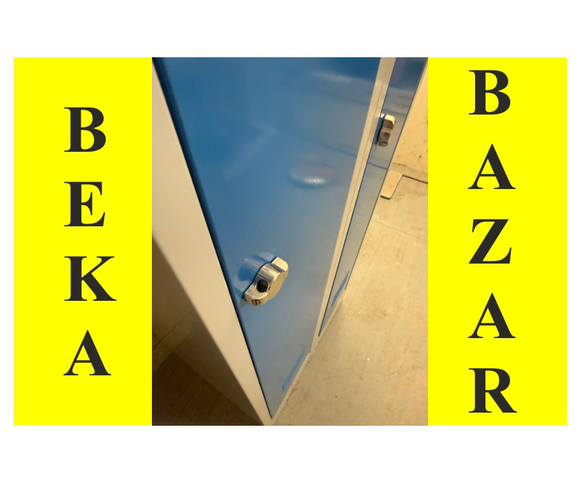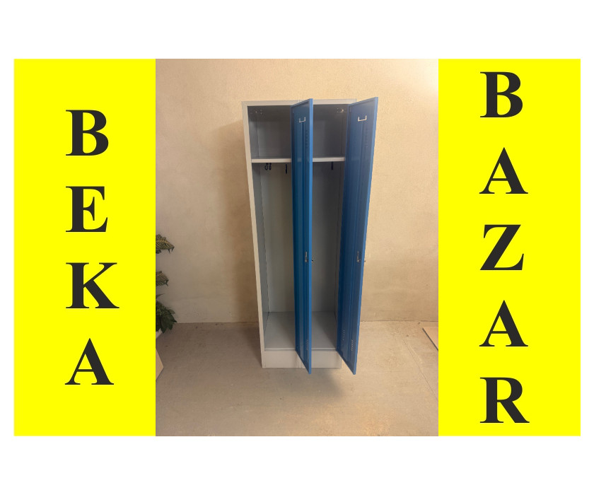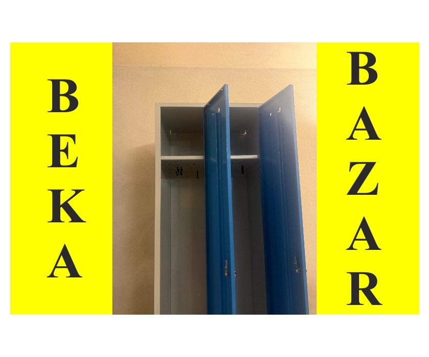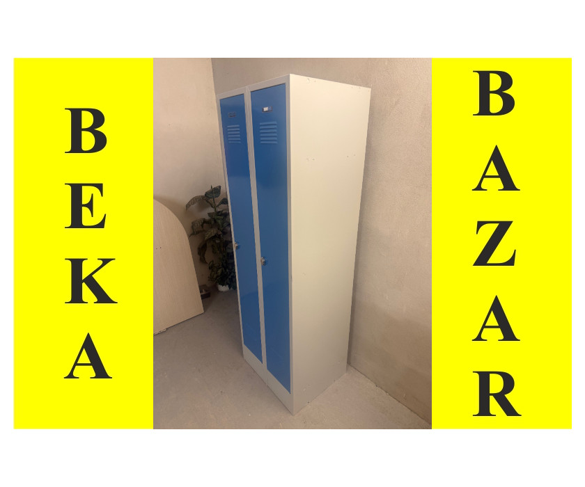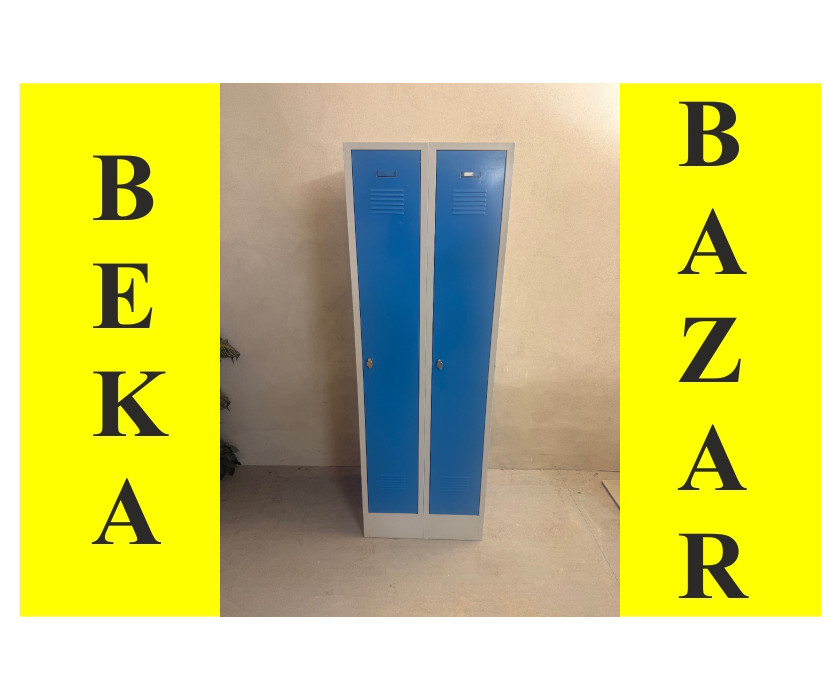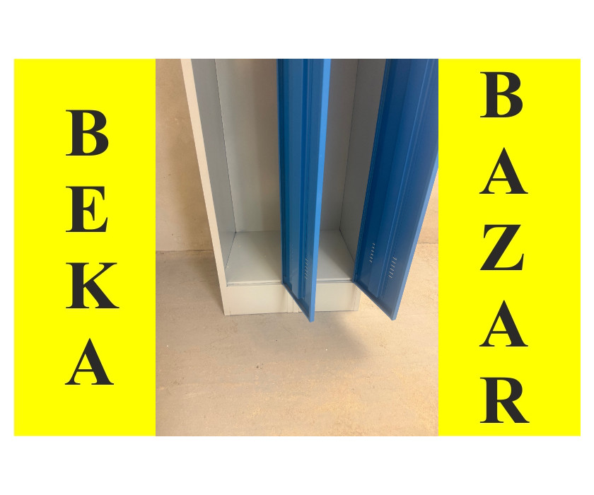 K prodeji nabízíme plechové skříně pro 2 osoby. Skříně jsou šatní, v modré barvě a mají visací zámek. Uvnitř skříně je 1 police v horní části, pod policí je držák na ramínka a jsou k dispozici i háčky. Korpus skříně je šedý a stojí na kovovém soklu. Celkově jsou skříně v dobrém stavu.