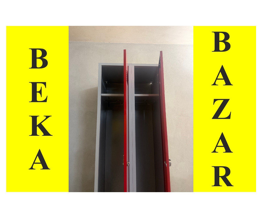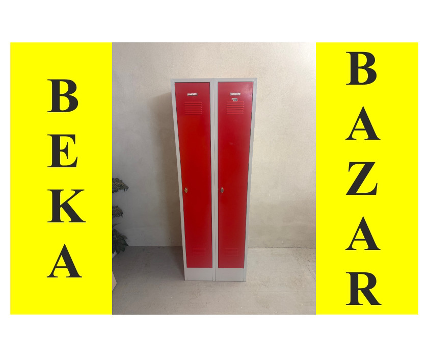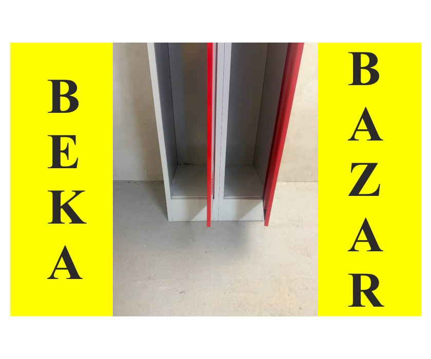 K prodeji nabízíme plechové skříně pro 2 osoby. Skříně jsou šatní, v červené barvě a mají visací zámek. Uvnitř skříně je 1 police v horní části, pod policí je držák na ramínka a jsou k dispozici i háčky. Korpus skříně je šedý a stojí na kovovém soklu. Celkově jsou skříně v dobrém stavu.