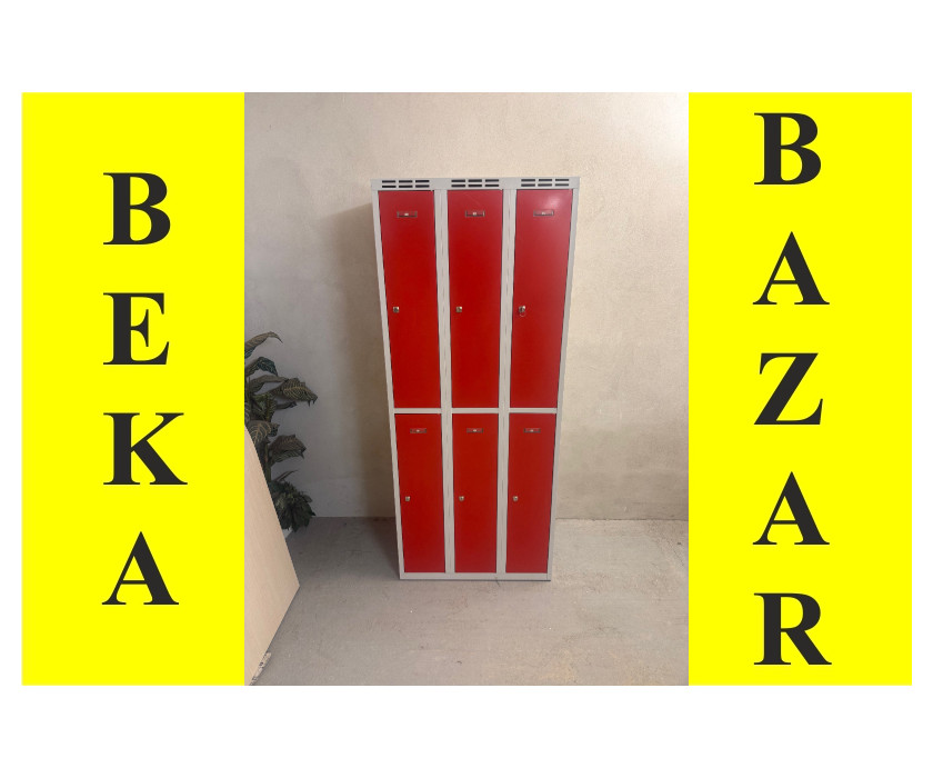 Nabízíme k prodeji plechové šatní skříně v červené barvě. Skříně jsou vhodné pro 6 osob a jsou s klíčem. Korpus skířní je šedý a skříň stojí na kovovém soklu.