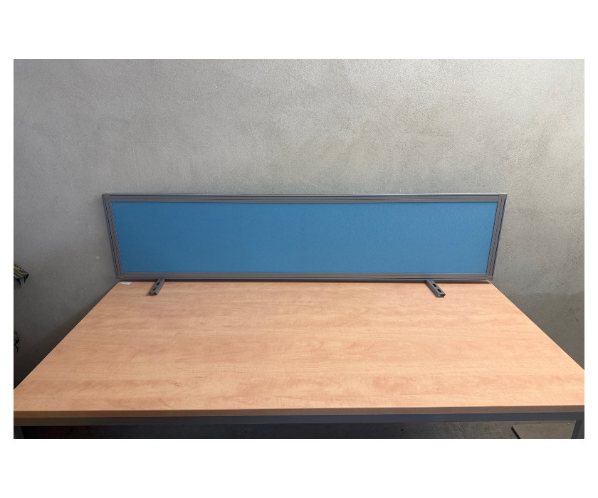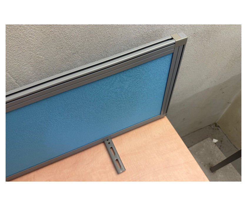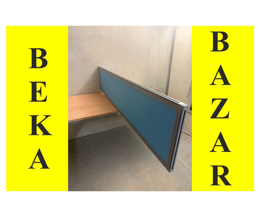 K prodeji nabízíme kancelářský paravan modré barvy. Paravan značky Techo, hliníkový šedý rám, hliníkové -kovové držáky, uchycení pod stůl. Paravan je dřevotříska potažená látkou.