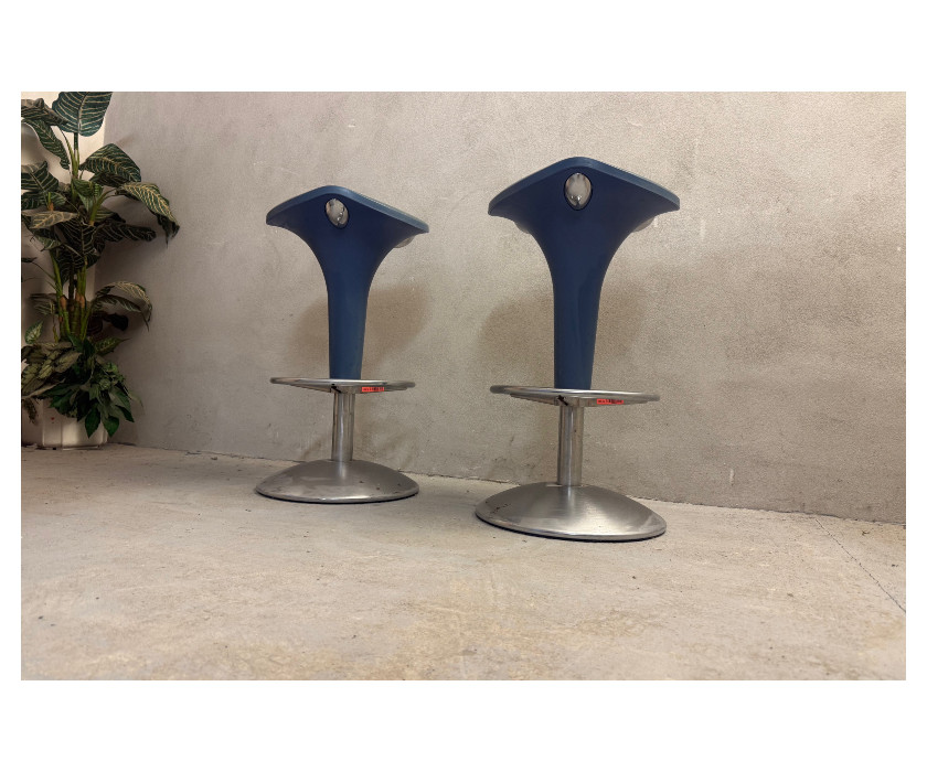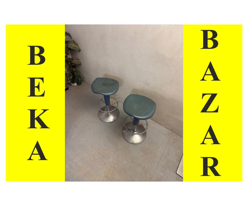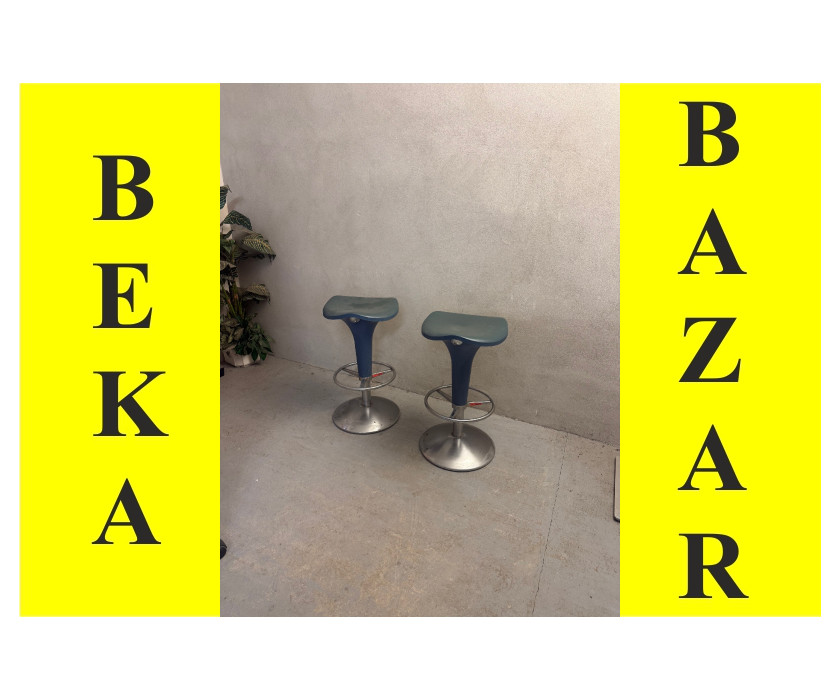 Na predaj ponúkame barovú svetlo modrú stoličku na jednej nohe. Noha kovová, na nohe je okrúhly nánožník. Spodná časť je okrúhly podstavec. Podsedák je plastový.