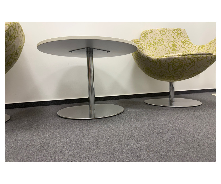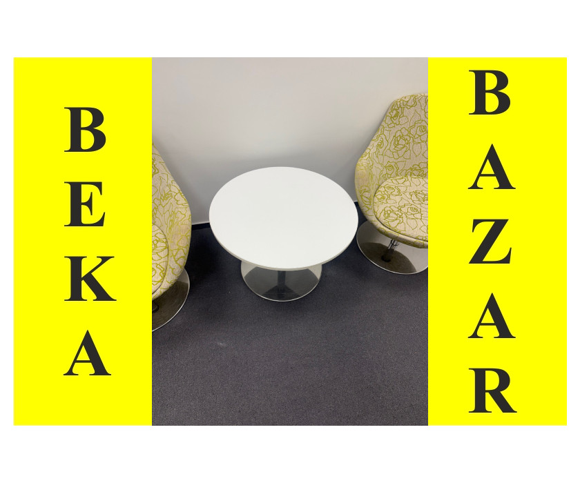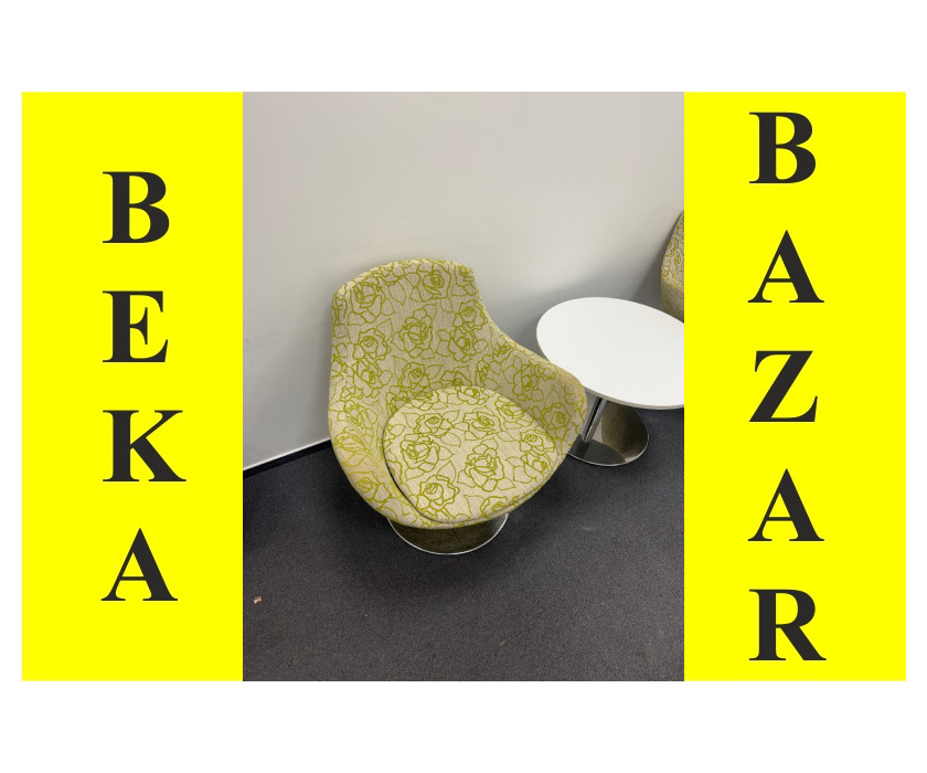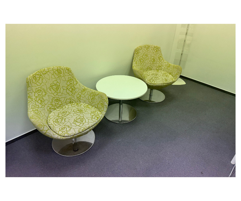 Na predaj ponúkame set 2 kresiel s okrúhlym stolíkom. Kreslá sú do zelenej farby, majú jednu kovovú nohu a sú otočné. Stolík má bielu dosku a jednu kovovú nohu s okrúhlym podstavcom. Kreslá aj stolík sú v dobrom stave.