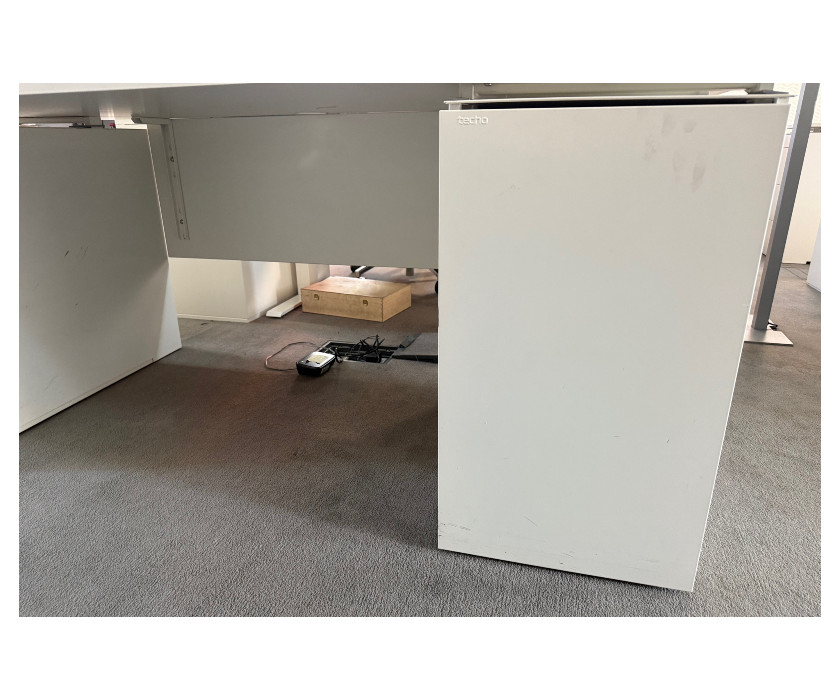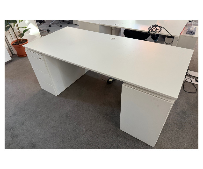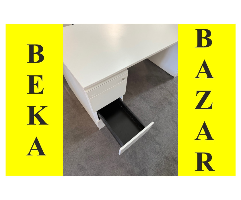 Na predaj ponúkame kancelársky PC stôl v bielej farbe, ktorý má na jednej strane kontajner a na druhej strane element. Ponúkame možnosť prevedenia kontajner na pravej strane a element na ľavej alebo obrátene, teda kontajner na ľavej strane a element na pravej strane. Kontajner má prvý šuplík plastový a úzky na drobné kancelárske veci, zvyšok šuplík - 3 šuplíky, sú plechové. Niektoré kontajnery majú kľúč. Element sa dá použiť aj na závesné šanóny. Časť na zavesenie šanónov je vychádzková. Celkom má element 2 poschodia. Doska stola má záslepku na káble. Celkovo je stôl v dobrom stave.