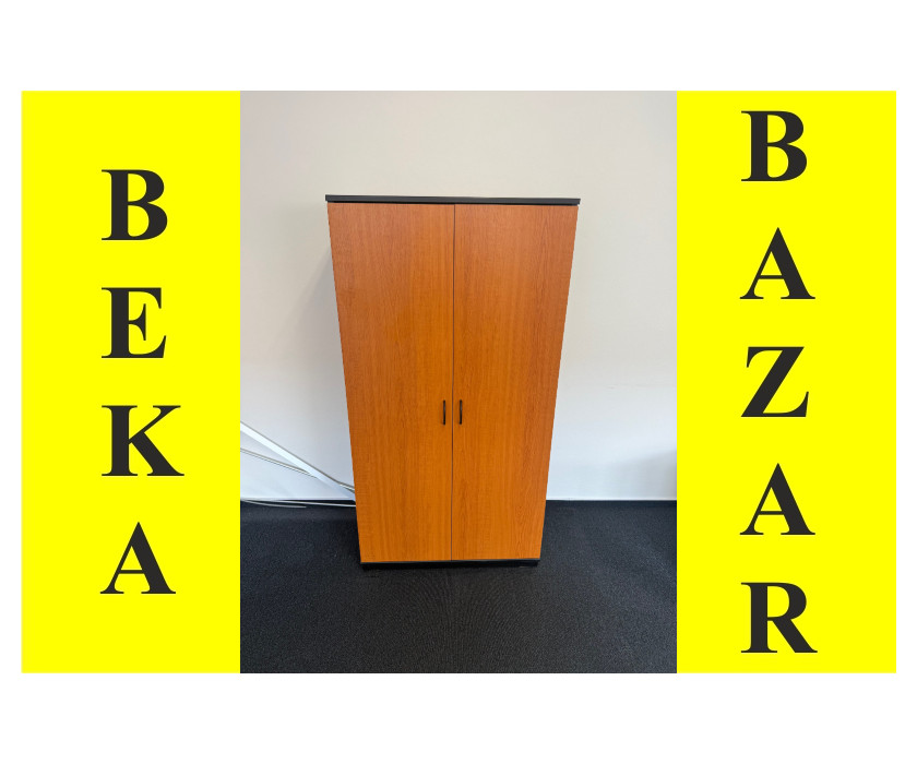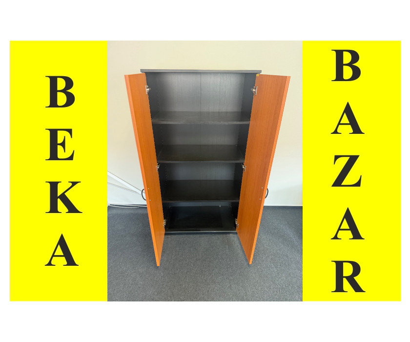 Ponúkame na predaj kancelársku regálovú skriňu v dekore čerešňa. Skriňa má dvere originál bez zámku, kovové rukoväte. Korpus skrine je čierny a dvere v dekore čerešňa. Skriňa stojí na drevenom sokli a vyrovnávacích nožičkách. V dobrom stave.