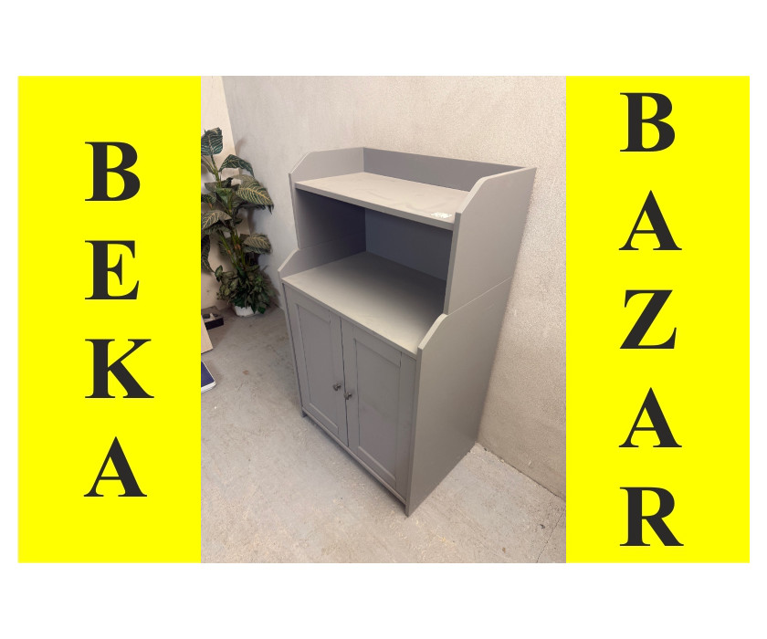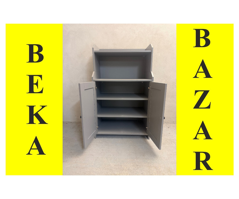 Na predaj ponúkame kancelársku šedú skriňu Ikea. Skriňa má hornú dosku slúžiacu ako odkladací priestor s bočnými mantinelmi. Vnútri skrine sú 2 police a medzi vrchnou časťou a skriňou je regálová otvorená časť. Dvere majú drevené rukoväte a skriňa má drevený sokel.