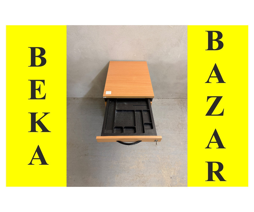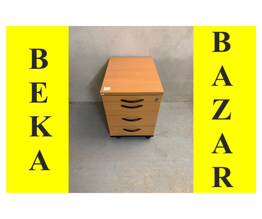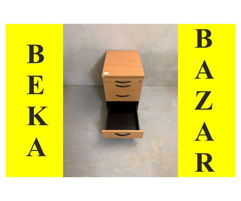 Na predaj ponúkame kancelársky kontajner v dekore buk. Kontajner má 4 šuplíky, prvý úzky plastový na drobné veci, zvyšok plechový. Rukoväte sú kovové čierne. Kontajner má čierne boky, má kľúč a má kolieska. Celkovo je v dobrom stave.