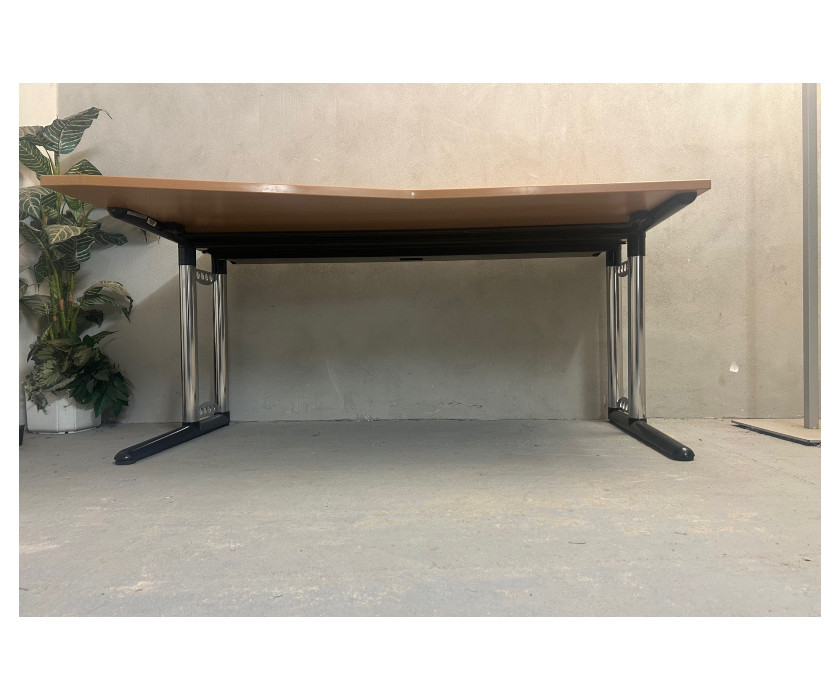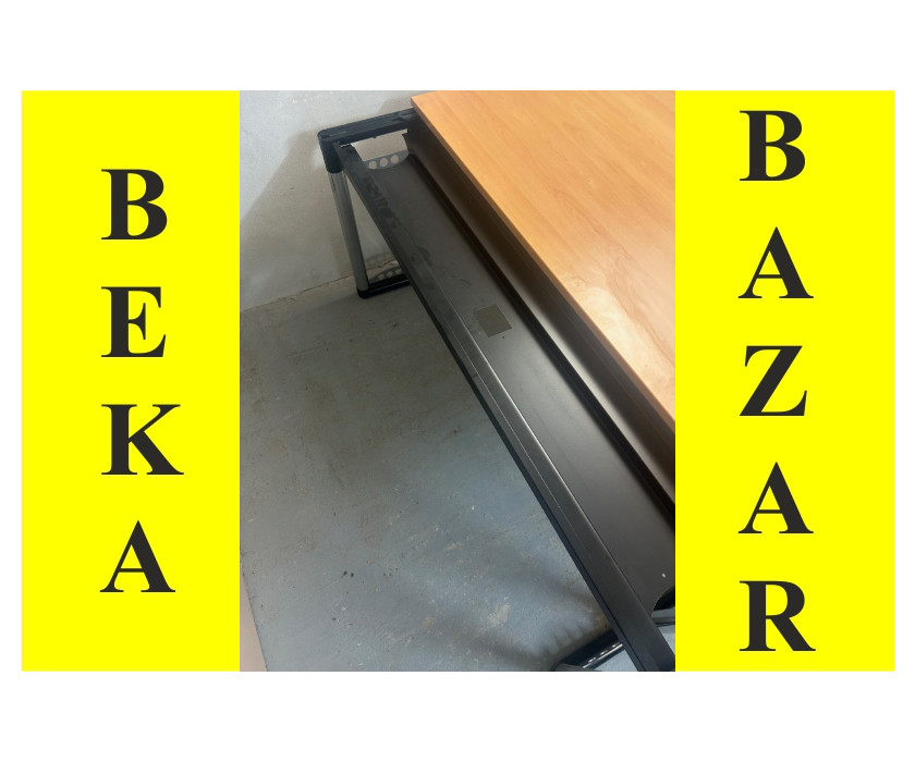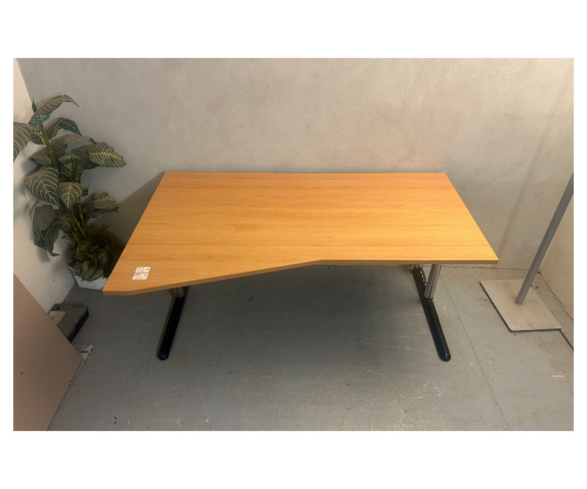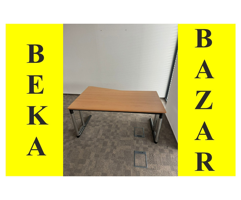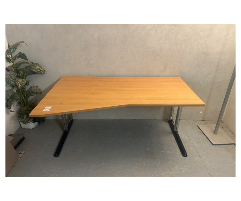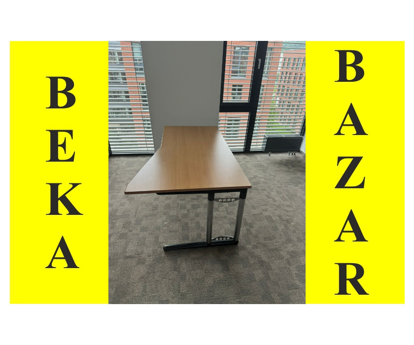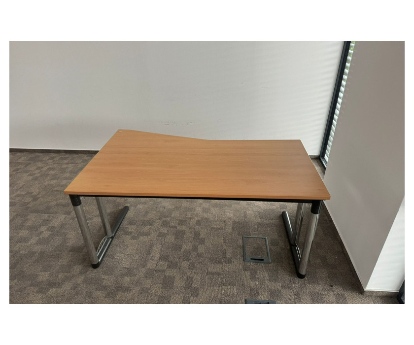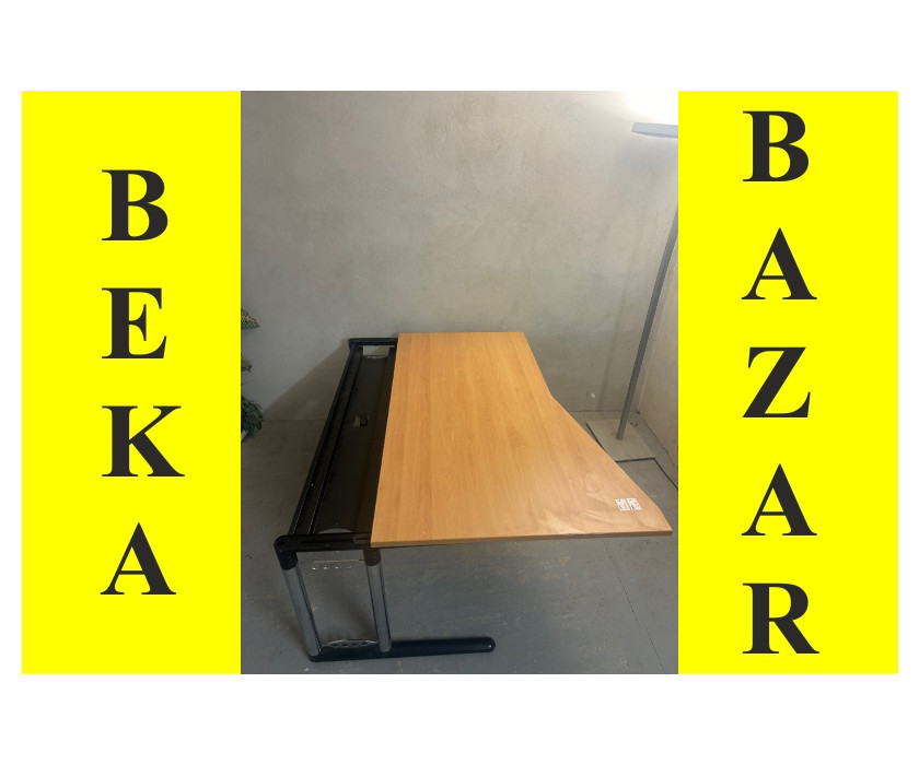 Na predaj ponúkame kancelársky PC stôl skosený, v pravom aj ľavom prevedení. Stôl je od výrobcu značky Werndl, je v dekore buk. Konštrukcia je kovová pevná, nohy majú vyrovnávacie nožičky. Doska stola hrubá 2,5 cm, dosku je možné vysunúť smerom k sebe, pre lepší prístup ku káblom.
